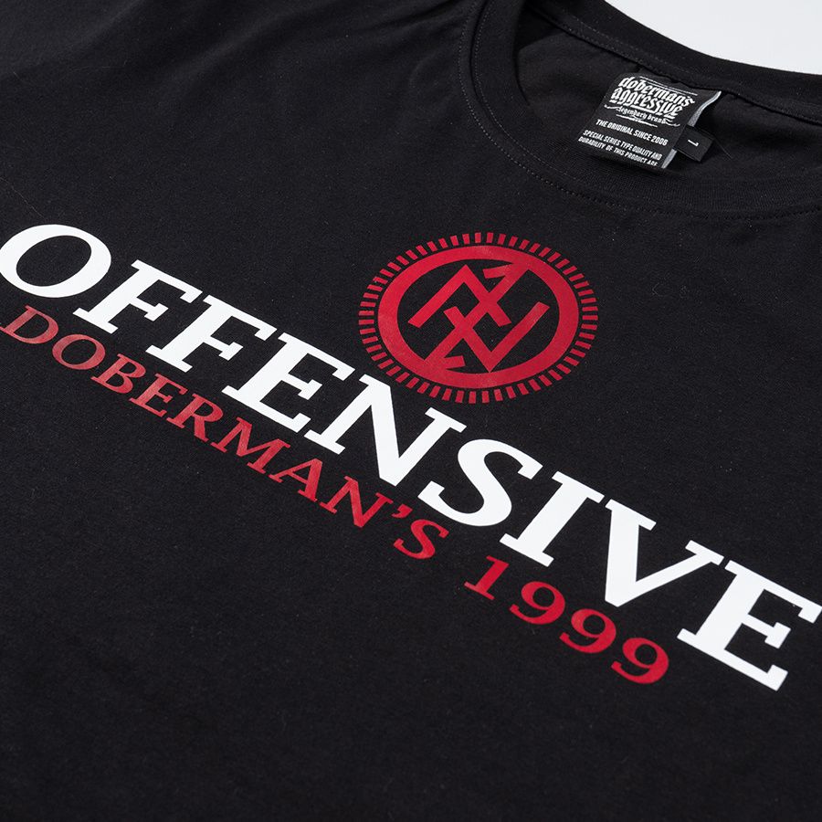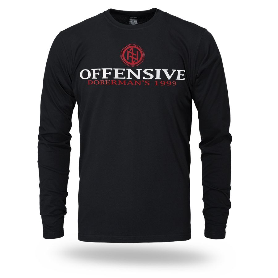 Model with a round neckline finished with a ribbed trim and long sleeves, providing comfort on cooler days. The front features a bold print with a large “OFFENSIVE” lettering, complemented by the slogan “Doberman’s 1999” and the brand’s distinctive symbol placed centrally above the typography. The back remains plain, emphasizing the minimalist character of the cut and highlighting the strong sport-street accent on the front.