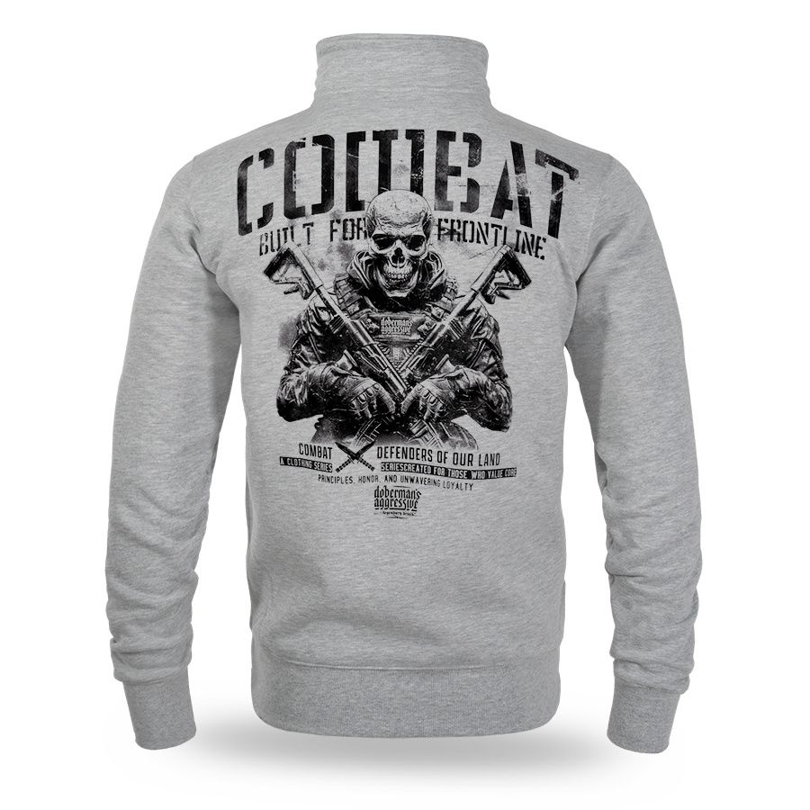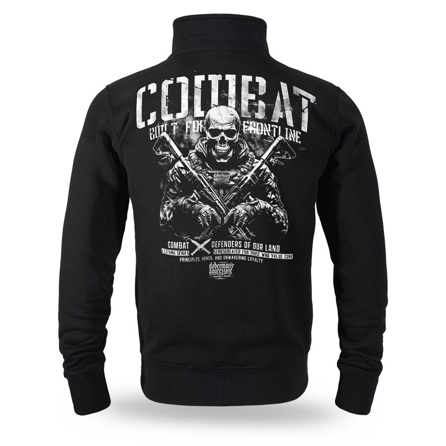 The back is decorated with a large, bold graphic with a tactical motif and the slogan “Combat – Built for the Frontline,” emphasizing the military-inspired character of the collection. A smaller emblem referring to the main motif is placed on the chest. The hem and cuffs are finished with elastic ribbing to ensure a good fit and comfort. The model combines functionality with a strong, distinctive style inspired by military aesthetics.