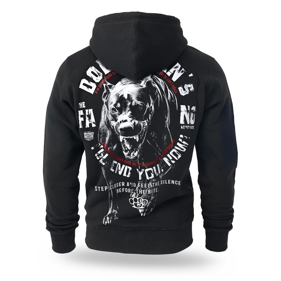 Model equipped with an adjustable hood with drawstrings and a full-length zipper closure. The front features practical kangaroo-style pockets. The back is decorated with a large, bold print with a tactical motif and the slogan “Combat – Built for the Frontline,” emphasizing the military-inspired character of the collection. A smaller emblem referring to the main graphic is placed on the chest. The hem and cuffs are finished with elastic ribbing to ensure a good fit and wearing comfort. The model combines functionality with a distinctive style inspired by military aesthetics.
