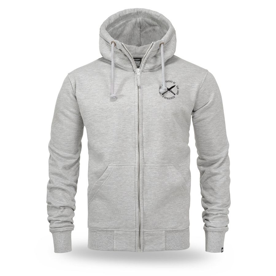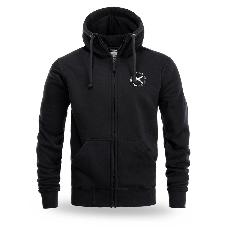 Model equipped with an adjustable hood with drawstrings and a full-length zipper closure. The front features practical kangaroo-style pockets. The back is decorated with a large, bold print with a tactical motif and the slogan “Combat – Built for the Frontline,” emphasizing the military-inspired character of the collection. A smaller emblem referring to the main graphic is placed on the chest. The hem and cuffs are finished with elastic ribbing to ensure a good fit and wearing comfort. The model combines functionality with a distinctive style inspired by military aesthetics.