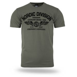 Model made in a comfortable, classic cut that ensures everyday comfort. The front features a large print with the inscription “Nordic Division – Nordmark Legendary Brand 1999”, complemented by a graphic wing motif and the brand emblem. The design is inspired by Nordic and military aesthetics, highlighting the distinctive and recognizable style of the brand. The T-shirt features a round neckline finished with elastic ribbing and classic sleeves, allowing it to fit well to the body and making it suitable for everyday wear.
