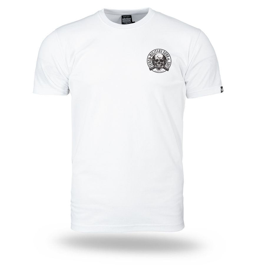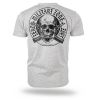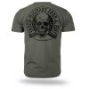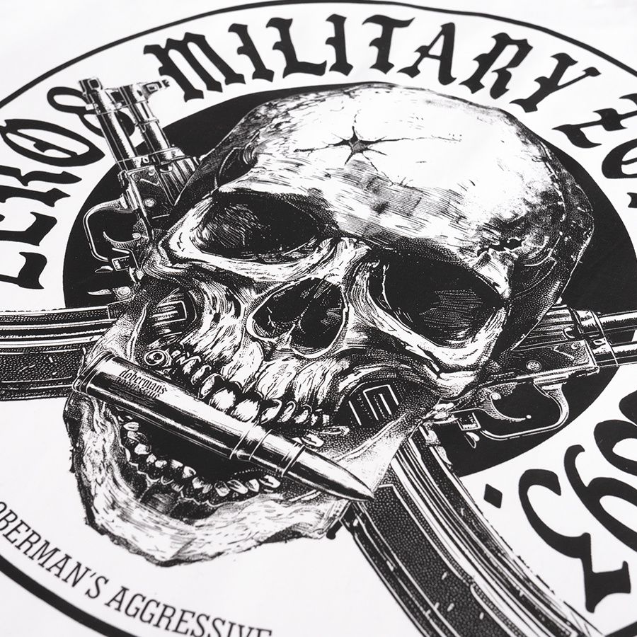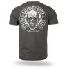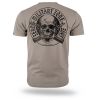 A model made in a comfortable, classic cut that ensures everyday comfort. The back features a large, bold graphic depicting a skull with crossed rifles, surrounded by the inscription “Frontline Military Zone 1987”. The motif is inspired by military aesthetics and emphasizes the raw, determined character of the design. A smaller print referencing the back graphic is placed on the chest, completing the overall composition. The T-shirt features a round neckline finished with elastic ribbing and classic sleeves, allowing it to fit well to the body and work perfectly for everyday wear.