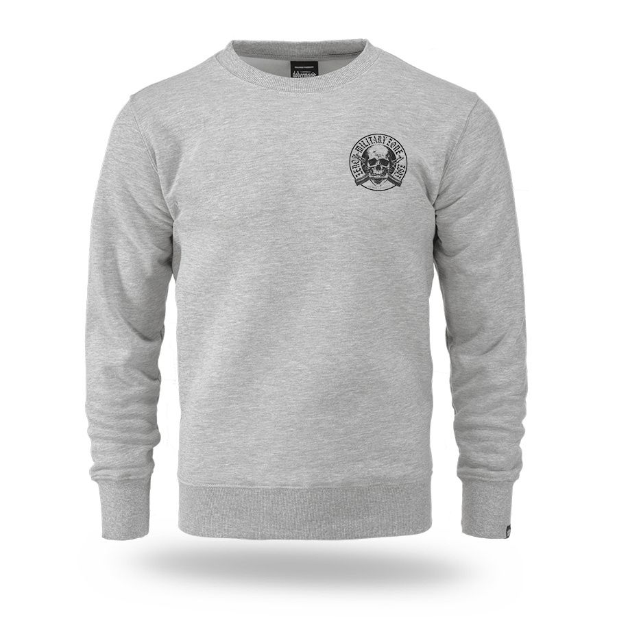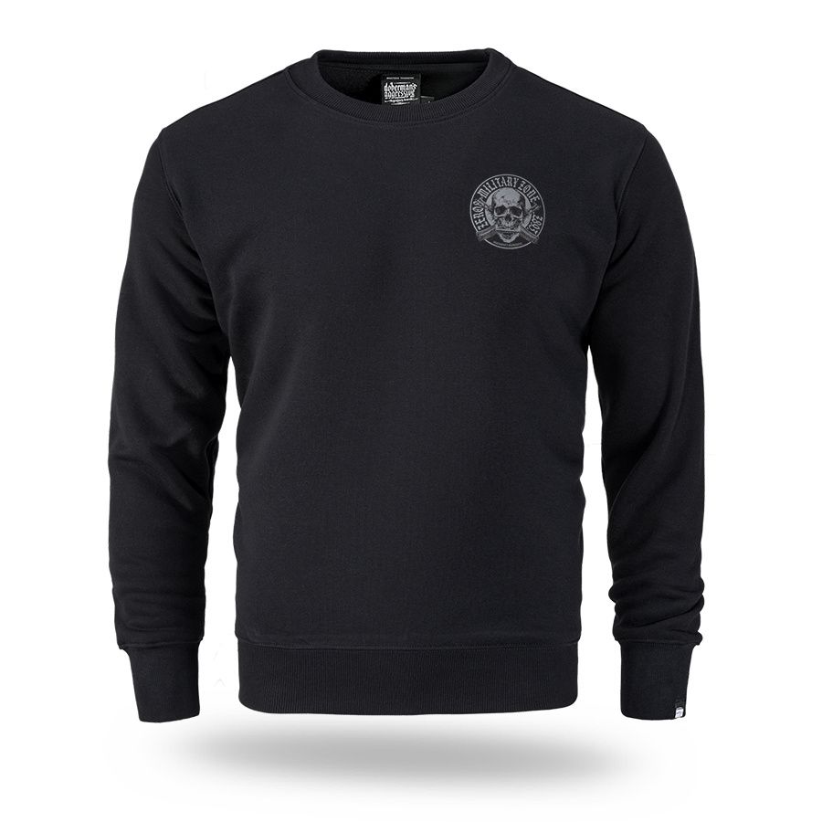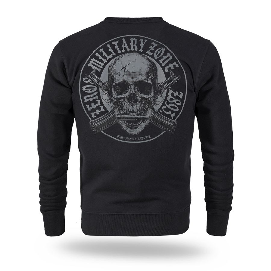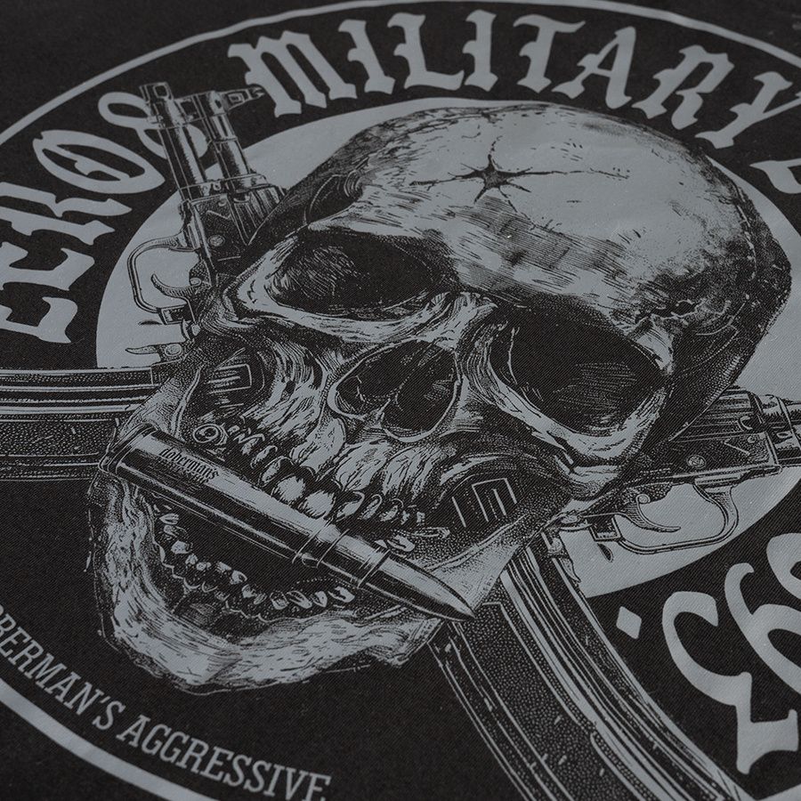 Model made in a comfortable, classic cut with a round neckline finished with an elastic ribbed trim. The back features a large, bold graphic depicting a skull with crossed rifles, surrounded by the inscription “Frontline Military Zone 1987”. The motif is inspired by military aesthetics and emphasizes the raw and determined character of the design. A smaller print referencing the back graphic is placed on the chest, completing the overall composition. The sleeves and bottom hem are finished with elastic ribbing, ensuring a good fit and everyday comfort.
