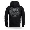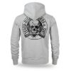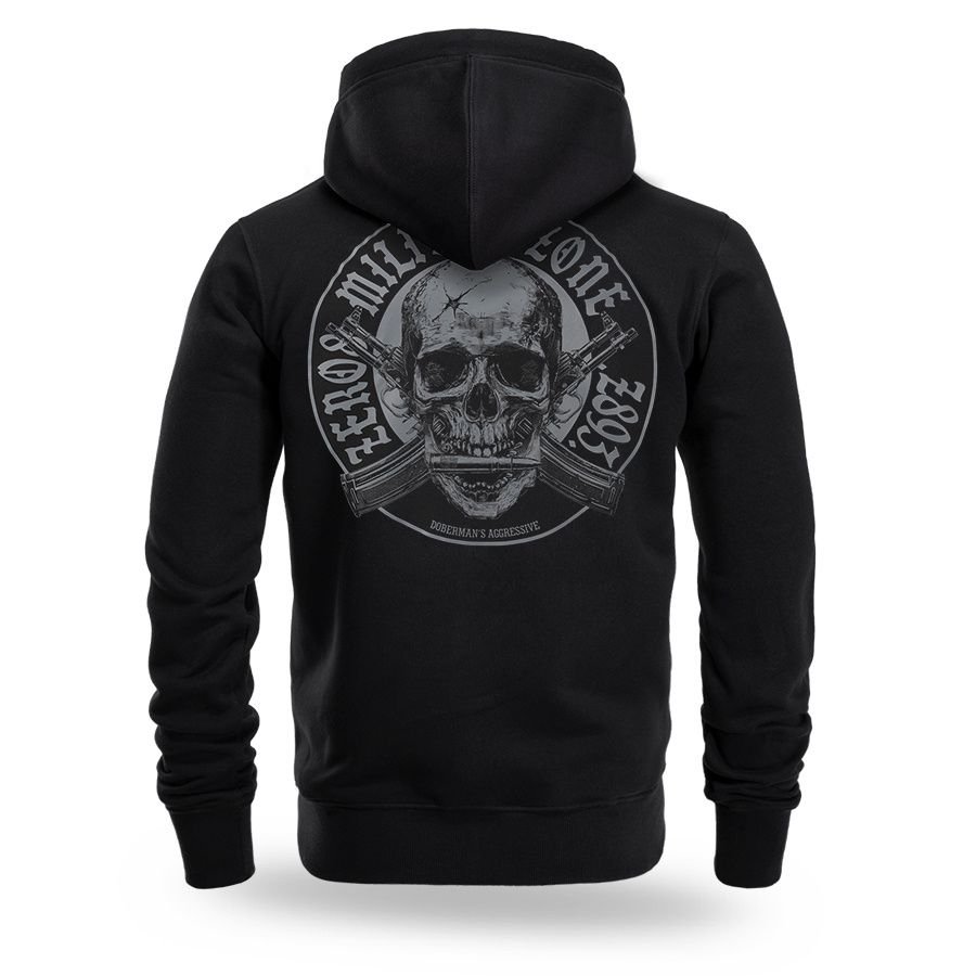 Model made in a comfortable, classic cut with an adjustable hood featuring drawstrings and a full-length zipper closure. The back features a large, bold graphic depicting a skull with crossed rifles, surrounded by the inscription “Frontline Military Zone 1987”. The motif is inspired by military aesthetics and emphasizes the raw and determined character of the design. A smaller print referencing the back graphic is placed on the chest, completing the overall composition. The hoodie features two practical front pockets and elastic ribbed cuffs and hem, ensuring a good fit and everyday comfort.