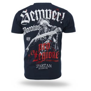 The model is made in a comfortable, classic cut with a round neckline. On the back there is a large, dynamic print depicting a warrior wearing a helmet and holding a sword, along with the inscriptions “Semper Paratus” and “Pro Legione”, referring to military symbolism and the spirit of readiness for action. A small print is placed on the front at chest level. The T-shirt is designed for everyday wear, combining comfort with the distinctive style characteristic of the Doberman’s Aggressive brand.