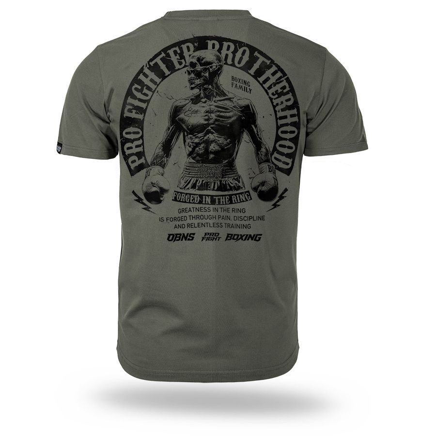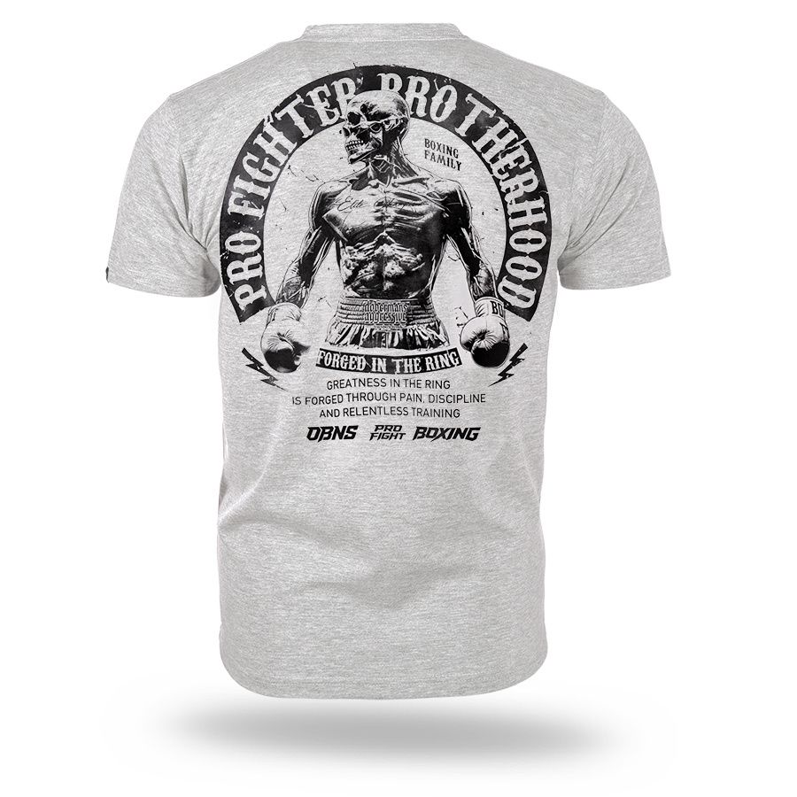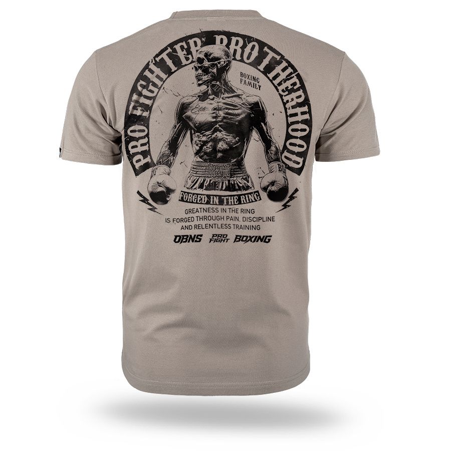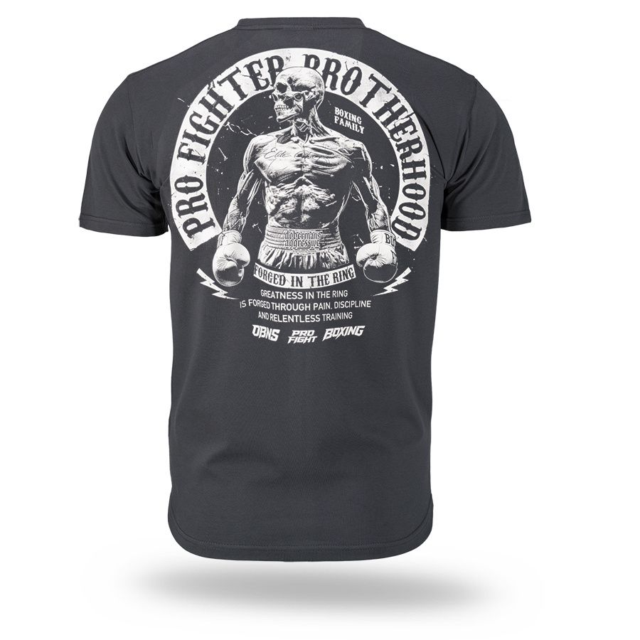 The model is made in a comfortable classic cut with a round neckline and short sleeves. On the back there is a large print featuring a boxing fighter and the inscription “Pro Fighter Brotherhood – Forged in the Ring”, referring to the spirit of fighting, determination and brotherhood in the world of combat sports. A smaller logo in the same style is placed on the chest. The T-shirt was designed for everyday use, combining comfort with a distinctive style inspired by boxing. Carefully made print and solid finishing emphasize the character and durability of the model.