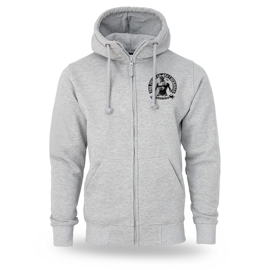 The model is made in a comfortable, sporty cut with a hood adjustable with drawstrings and a full-length zipper. The hoodie features two front pockets and ribbed cuffs and hem for a better fit. On the back there is a large print featuring a boxing fighter and the inscription “Pro Fighter Brotherhood – Forged in the Ring”, emphasizing strength, determination and the spirit of fighting. A smaller logo in the same style is placed on the chest. The model combines everyday comfort with a distinctive style inspired by the world of boxing and combat sports.