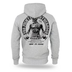 The model is made in a comfortable, sporty cut with a hood adjustable with drawstrings and a full-length zipper. The hoodie features two front pockets and ribbed cuffs and hem for a better fit. On the back there is a large print featuring a boxing fighter and the inscription “Pro Fighter Brotherhood – Forged in the Ring”, emphasizing strength, determination and the spirit of fighting. A smaller logo in the same style is placed on the chest. The model combines everyday comfort with a distinctive style inspired by the world of boxing and combat sports.