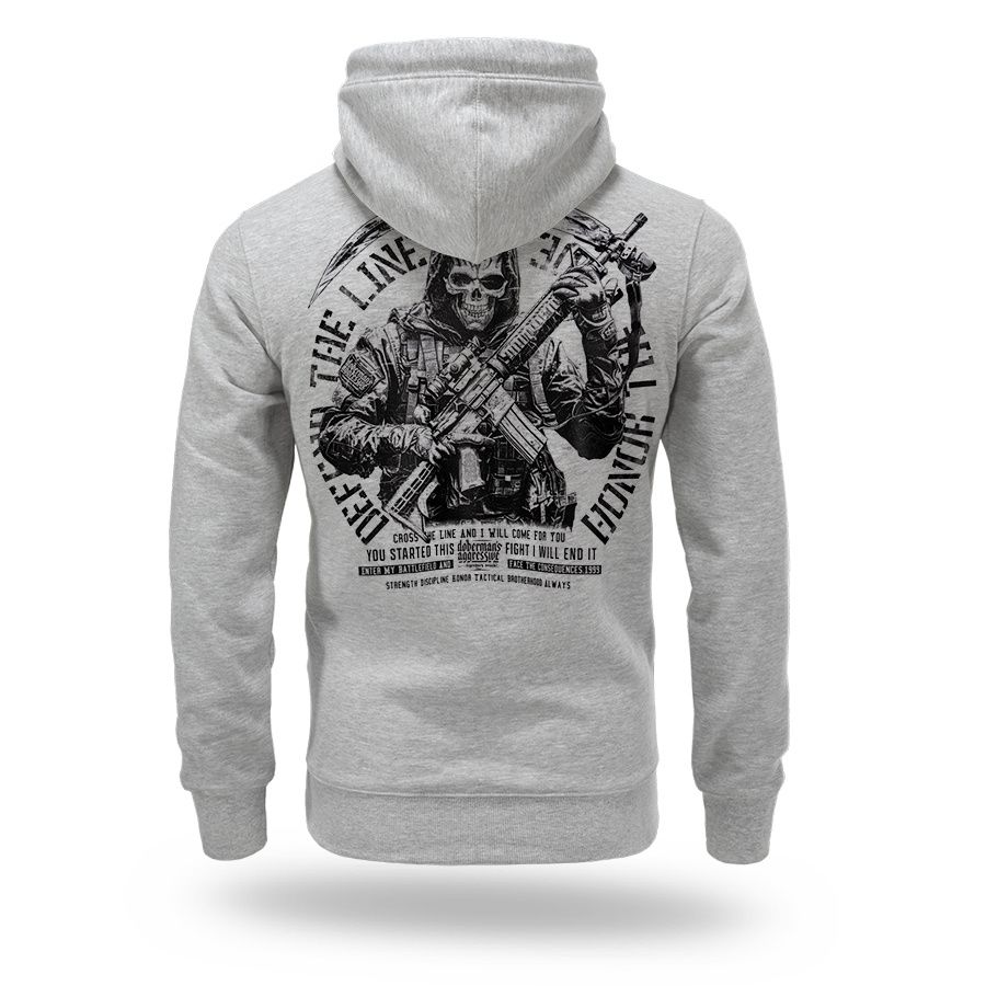 The model is made in a comfortable sporty cut with an adjustable hood with drawstrings and ribbed cuffs and hem for a better fit and everyday comfort. On the back there is a large print featuring an armed tactical-style character and the inscription “Protect – Live – Honor”, symbolizing courage, loyalty and readiness for action. A smaller minimalist logo is placed on the chest. The hoodie is designed for everyday use and combines comfort with a distinctive style inspired by military and tactical aesthetics. The carefully crafted print and solid finishing emphasize the character and durability of the model.