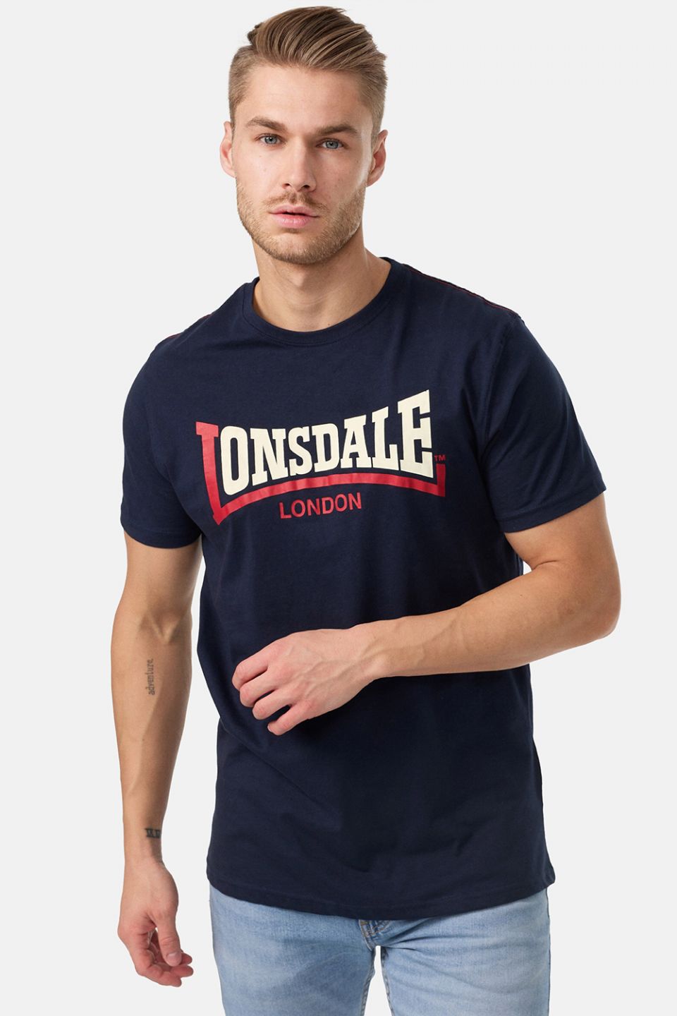 - t-shirt with two-colour logo lettering on the chest and a colour-contrasting decorative seam in the shoulder area.