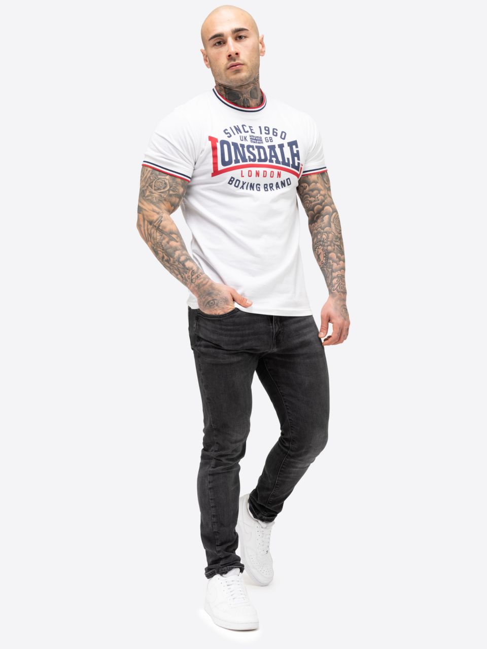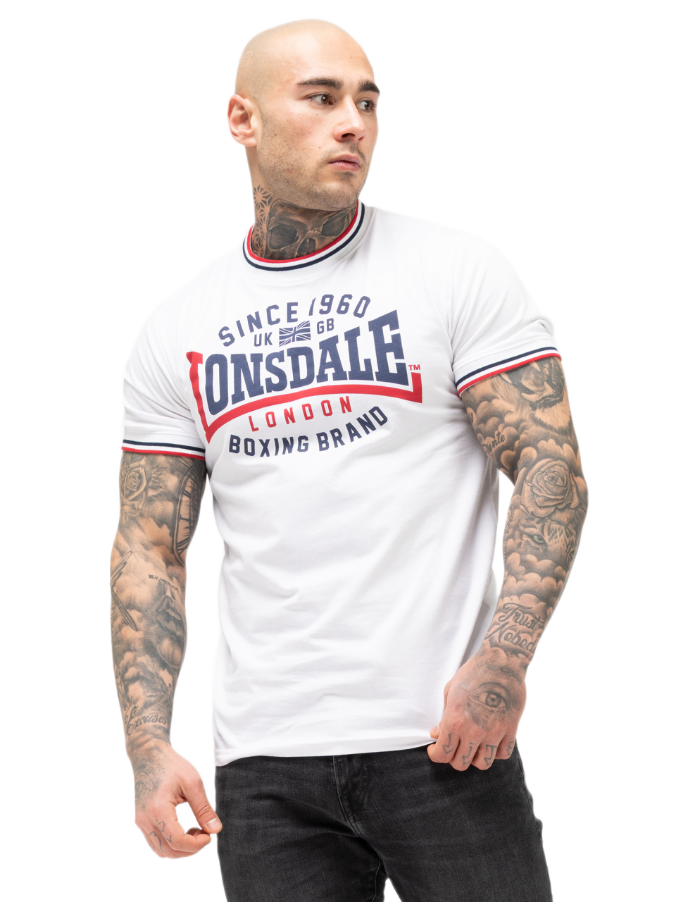 - T-shirt with a contrasting print on the front. The cuffs on the neckline and sleeve hems are striped and pick up the colours from the print. There is a woven label on the side seam.