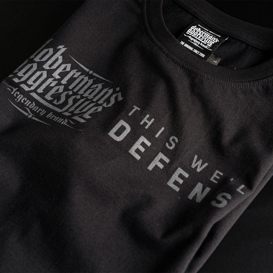 On the left sleeve all small label with the brand logo. On the front of the T-shirt on the chest is the brand logo, next to the logo says THIS WE’LL DEFENSE.