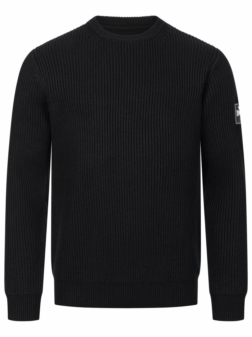 - Knitted crewneck sweater with patch on the left sleeve with 3D rubber print.